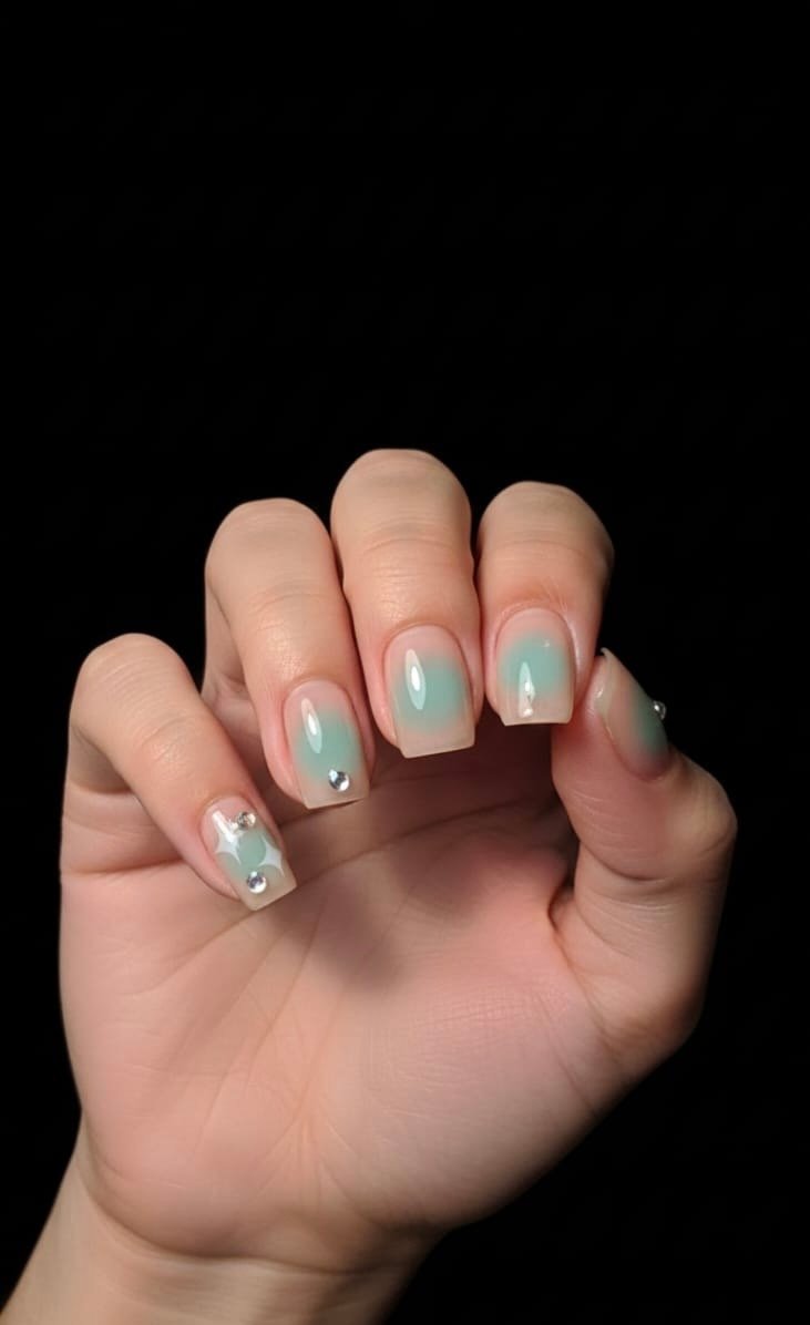 • Aura Artistry: Each nail features a soft, diffused teal center that fades seamlessly into a natural nude base, creating a trendy “aura” look that complements every skin tone.