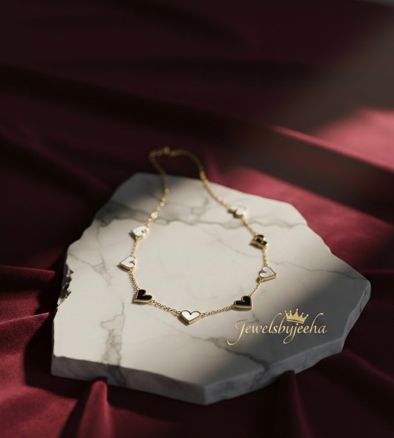 Why choose one side when you can have both? Our Eternal Love Station bracelet is designed for the woman who loves versatility. This exquisite piece features a series of finely crafted heart charms, meticulously inlaid with contrasting black and white enamel, spaced perfectly along a shimmering gold chain.